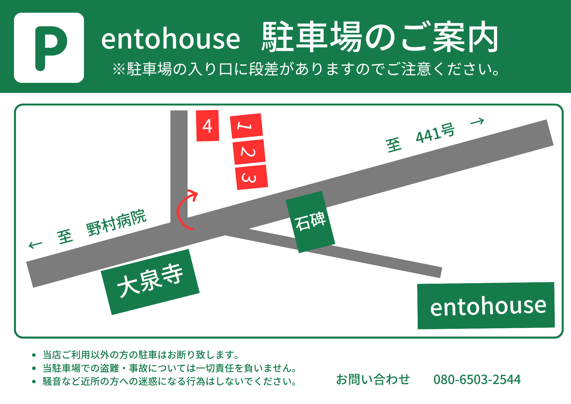 駐車場は徒歩3分以内の場所に数台分ございます。ご利用の際はご予約時にご連絡ください。